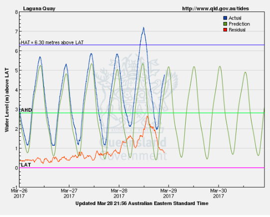 Water level graph for Laguna Quays, Queensland. The orange line depicts storm surge (height above normal astronomical tide), while the blue line represents total water level, including tides. Source: https://www.qld.gov.au/environment/coasts-waterways/beach/storm-sites/laguna-quays/